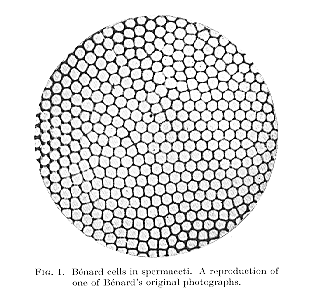 這是十九世紀,Benard在實驗室中所得到的蜂巢狀對流胞的照片。熱平均而穩定 的加在平底鍋的底下,在鍋內流體很淺的情況下,就會發生此類對流。這種形式 的對流胞稱為本納胞(Benard Cell)。