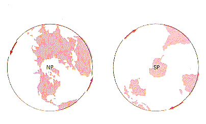 地球北半球繞北極逆時針方向自轉,南半球繞南極順時針方向旋轉。