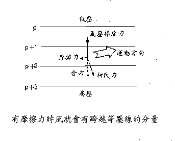 地面與空氣流動時的摩擦,會在與空氣移動方向完全相反的方向 上產生拖曳的效果。故柯氏力、氣壓梯度力和摩擦力達成平衡時 ,必然會有跨越等壓線的分量。