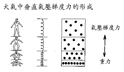但大氣分子太多了,不可能每個分子都落到地面上,所以會堆積 起來,而形成高度越低壓力越大,越高壓力越小的情形,因此上 下就有氣壓差,稱為氣壓梯度。有氣壓梯度就有氣壓梯度力,氣壓 梯度力使空氣向氣壓較小的地方加速運動(見下一頁)。但在 垂直方向,基本上向下的重力是和向上的氣壓梯度力成平衡的, 稱為「靜力平衡」。