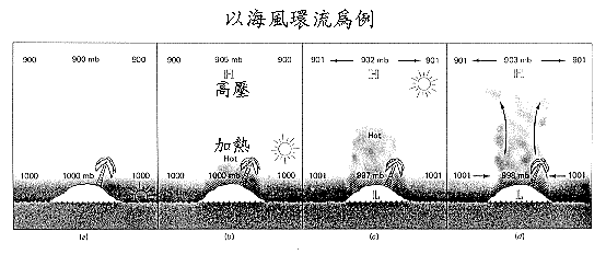 以海島為例。在白天日曬之下,陸地比海上熱,故陸地上的高層呈高壓, 使高層的空氣推向海上,低層的空氣自海上吹向陸地來補充,於是吹海風 。