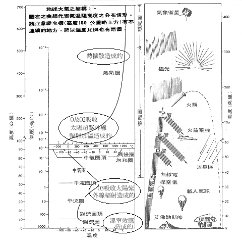故總結的說,上層熱氣層的高溫是由下熱氣層透過熱擴散(和熱傳導是同樣 的道理)傳上去的;而下熱氣層的高溫則是由於單原子狀態和雙原子狀態氧 ,吸收太陽超紫外線輻射(ultra-violet and extrem-ultra-violet radiation) 增溫而成的;平流層頂的高溫則是臭氧吸收太陽紫外線輻射造成的。而平流 層越靠近地面溫度越高的情形,則是二氧化碳和水汽吸收地球長波輻射(亦 即所謂「溫室效應」)造成的。