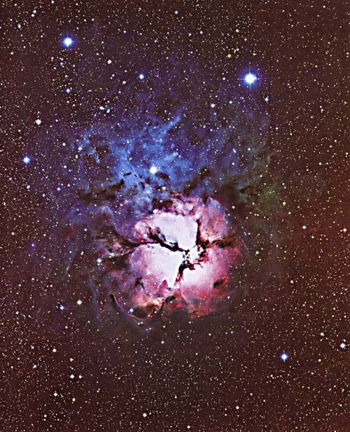 位 於 人 馬 座 的 三 裂 星 雲 (M20) 距 地 球 約 3200 光 年 , 同 時 具 有 發 射 星 雲 (泛 紅)與 反 射 星 雲 (泛 藍)的 雙 重 身 份 。